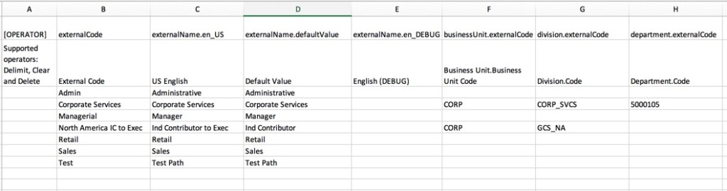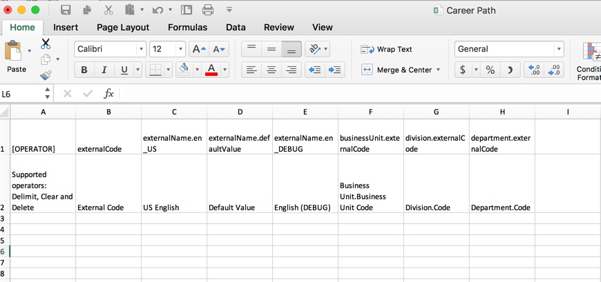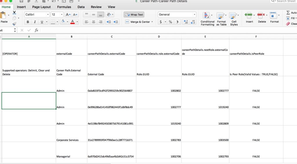 The file would mimic the fields populated when you name the career path. Below is an example of the exported career paths file.