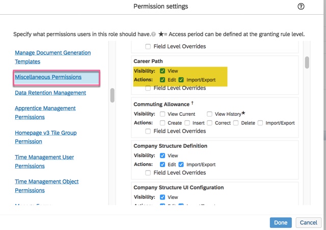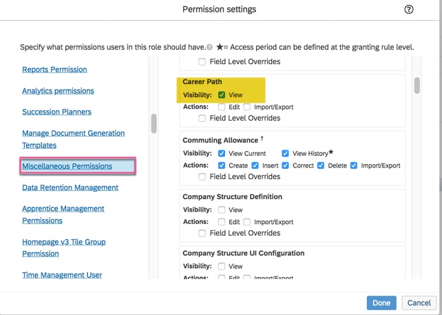 There are additional permissions needed for the admin to view and edit the Career Path. Under User Permissions>Miscellaneous Permissions, the admin will need Visibility and Actions permissions for Career Path.