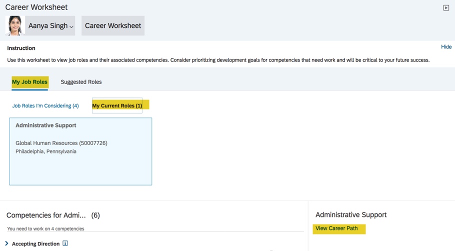 An employee may also see the career path for their current role on the My Current Roles sub-tab on the My Job Roles tab of the Career Worksheet.