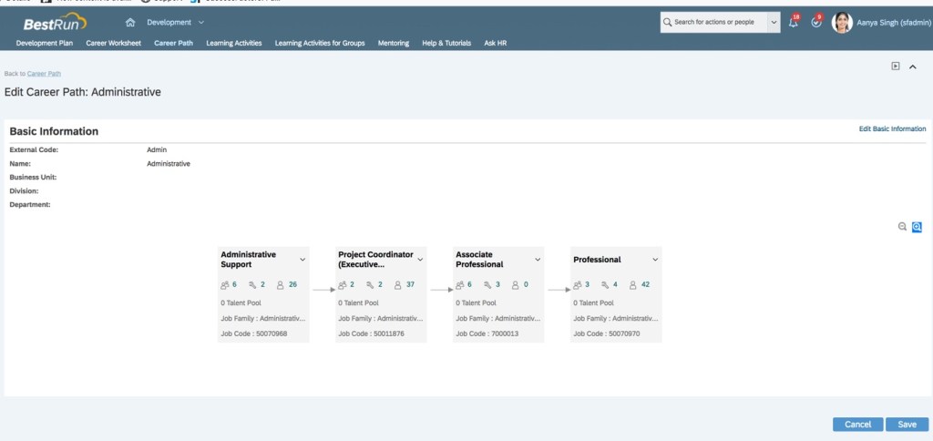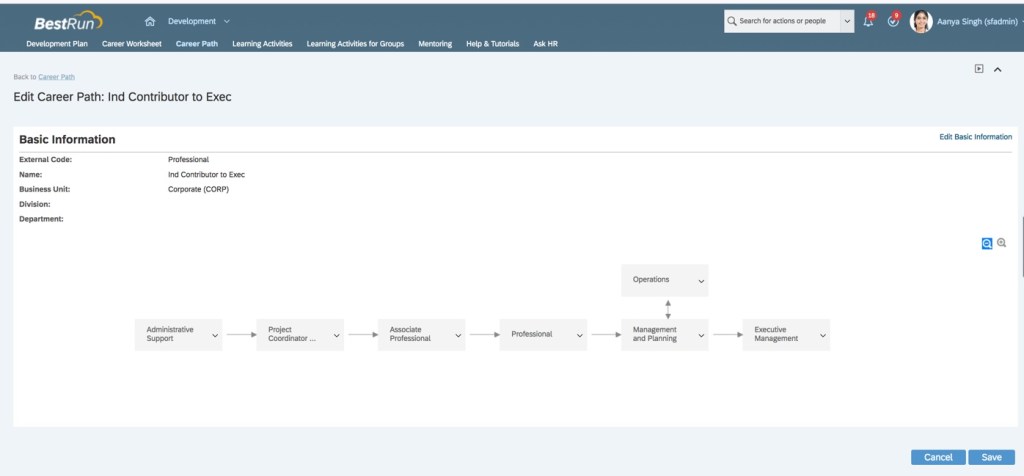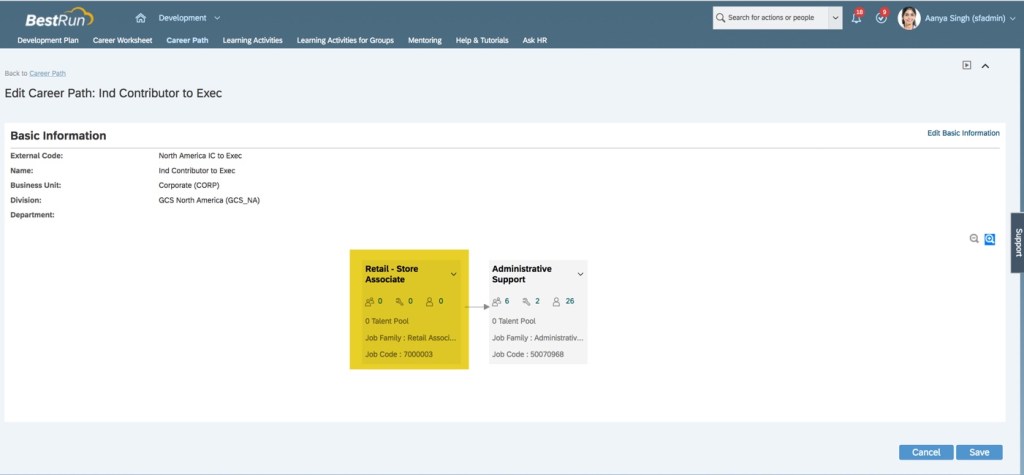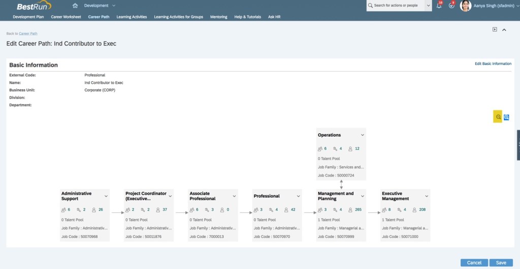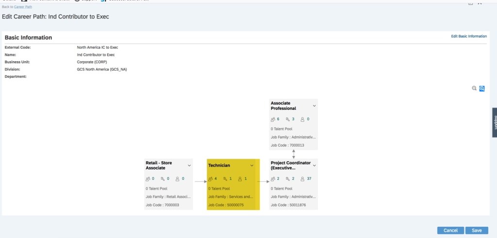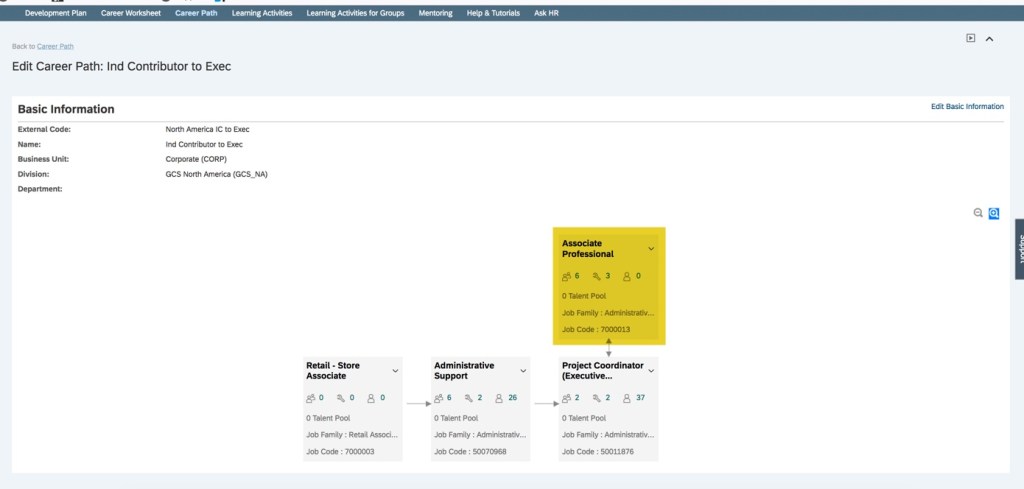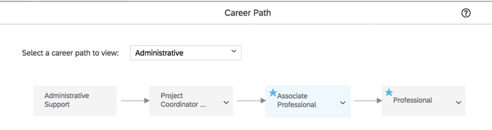 The SuccessFactors Career Worksheet, part of the Development module, may be configured to use Career Paths. Career Paths provide an employee with a graphical route of what their current or other roles may lead to. Career Paths aid an employee in planning how to develop their skills and competencies to advance into roles that interest them. Career Paths show a progression of roles that an employee may grow into.