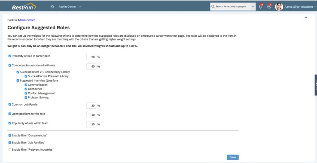 Suggested roles can be based on Career Paths created by the system admin or through an algorithm based on a set of criteria.   This is done via Configure Suggested Roles. The weightings that are set will determine how suggested roles appear on the career worksheet’s Suggested Roles page.