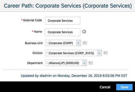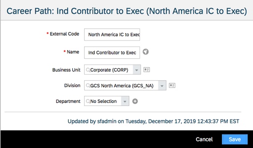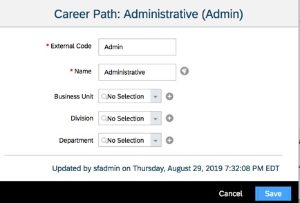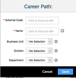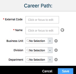 When creating a career path, a code and path name are required. Business unit, division and department can be selected to restrict access to the career path to the employees within those areas.
