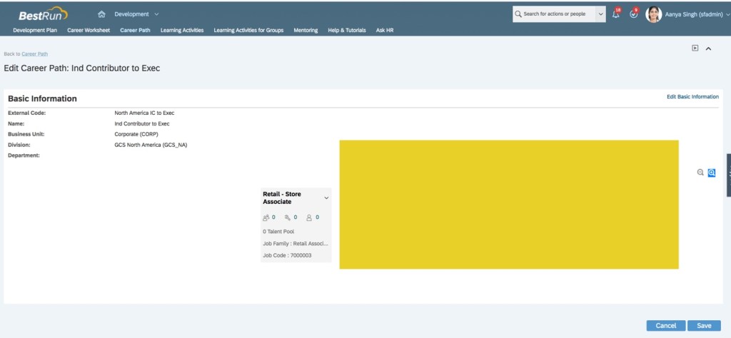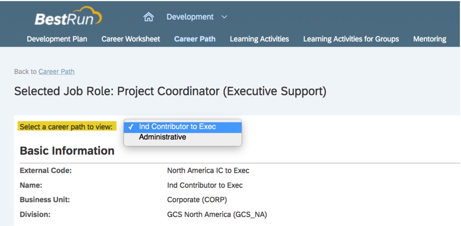 Based on configuration, the administrator may restrict employee access to Career Paths based on criteria such as role, department, or division.
