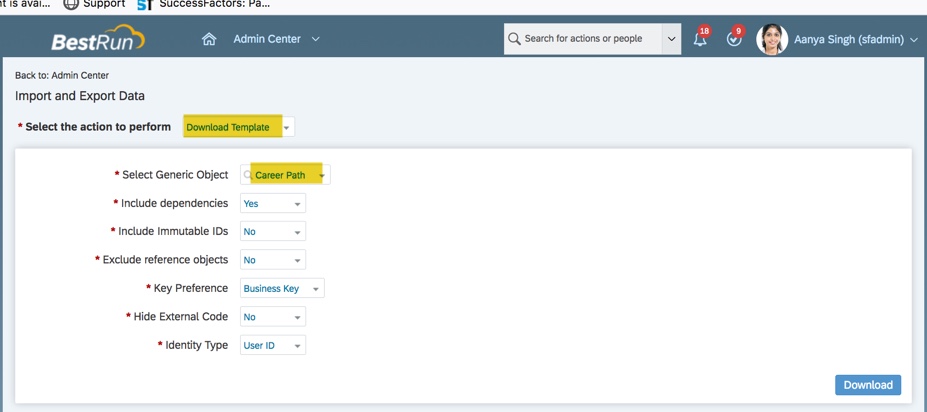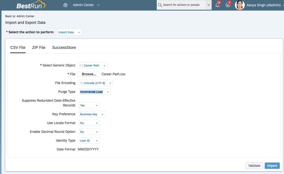 When updating a career path or adding a new career path, the Import and Export Data screen is used for the import as well.