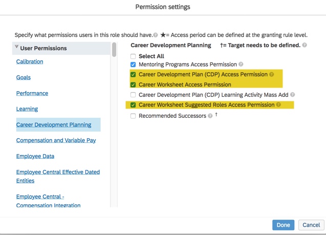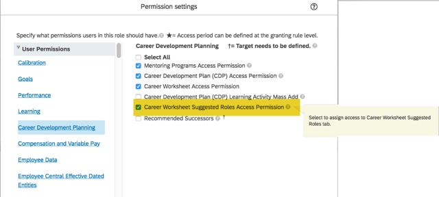 Now that the admin role has access to configure Career Paths, the employee role permissions should be set up. Under the User Permissions, the Career Development Planning section, the employee role should already have Career Development Plan (CDP) Access Permission and Career Worksheet Access Permission. In addition, this role will need Career Worksheet Suggested Roles Access Permission.