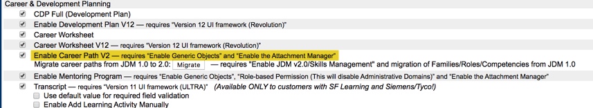 In addition to enabling the Development Plan V12 and the Career Worksheet V12v in Provisioning, enable Career Path V2. Be sure that Version 12 UI Framework, Enable Generic Objects and Enable the Attachment Manager are set as well.