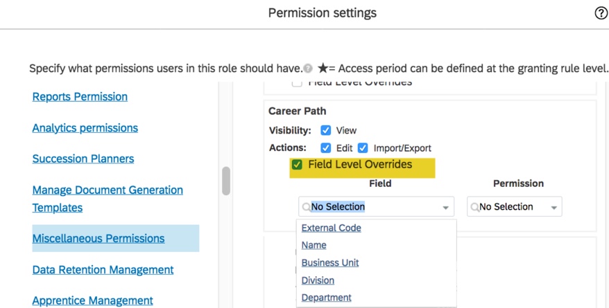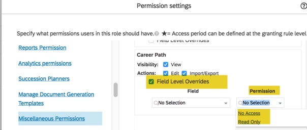 It is also possible to set field level overrides.  The Field Level Overrides option grants the right to specify which information to display or hide for a career path. This can be used to identify fields on the career path definition that can only be viewed by a role or to be hidden.