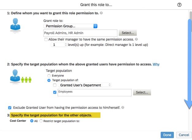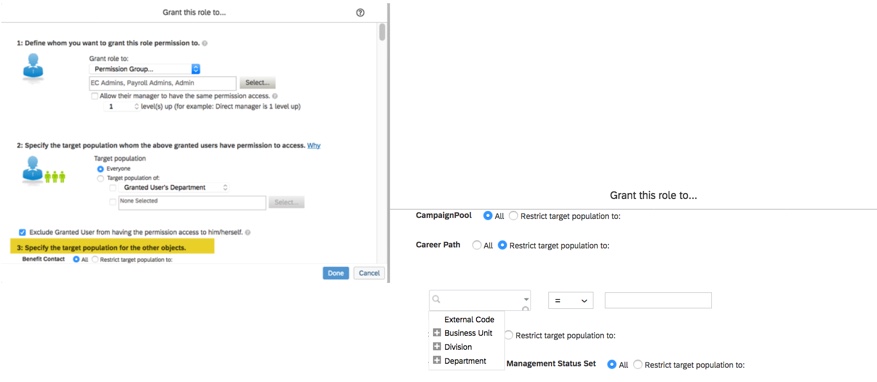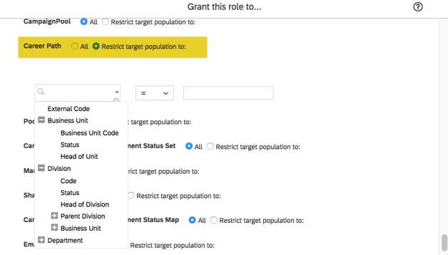 To limit the access to specific career paths, the role may have a target population specified. You may restrict the target population for Career Path by specifying the restrictions in the drop down menu.
