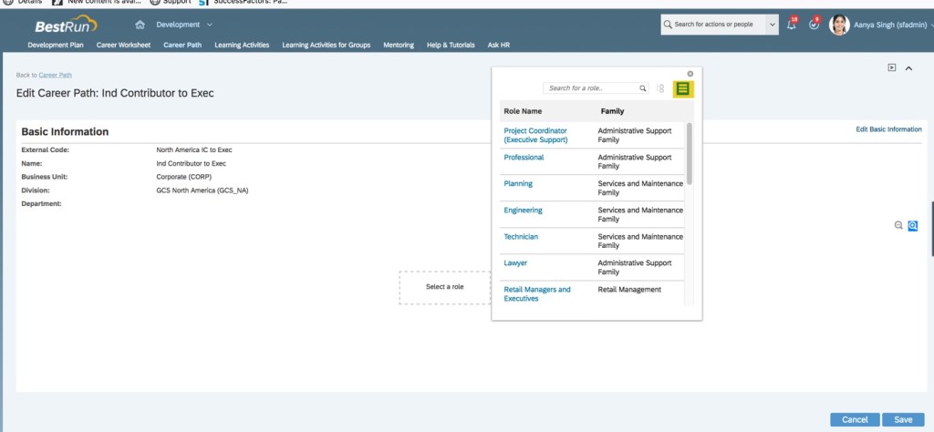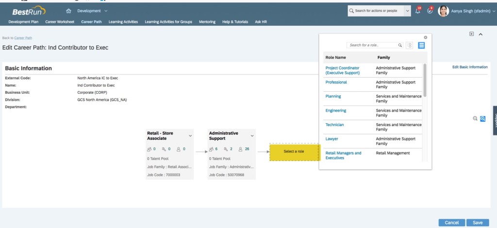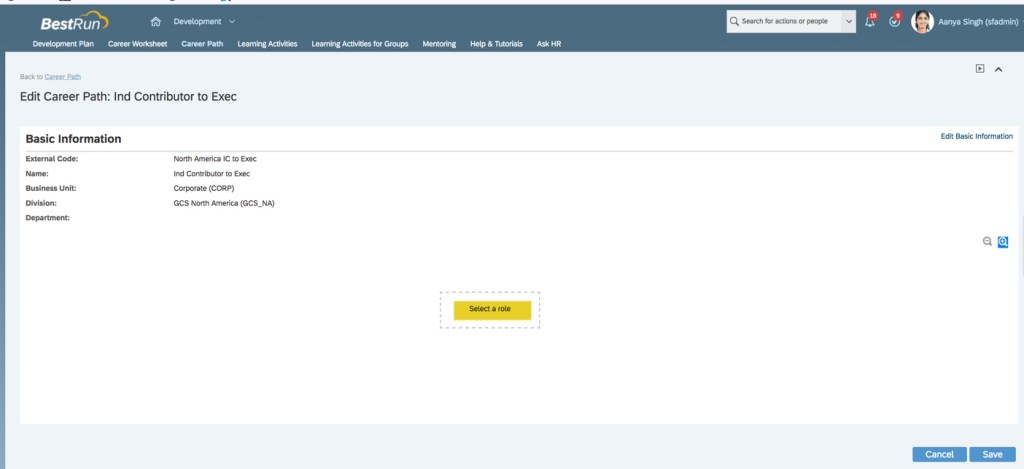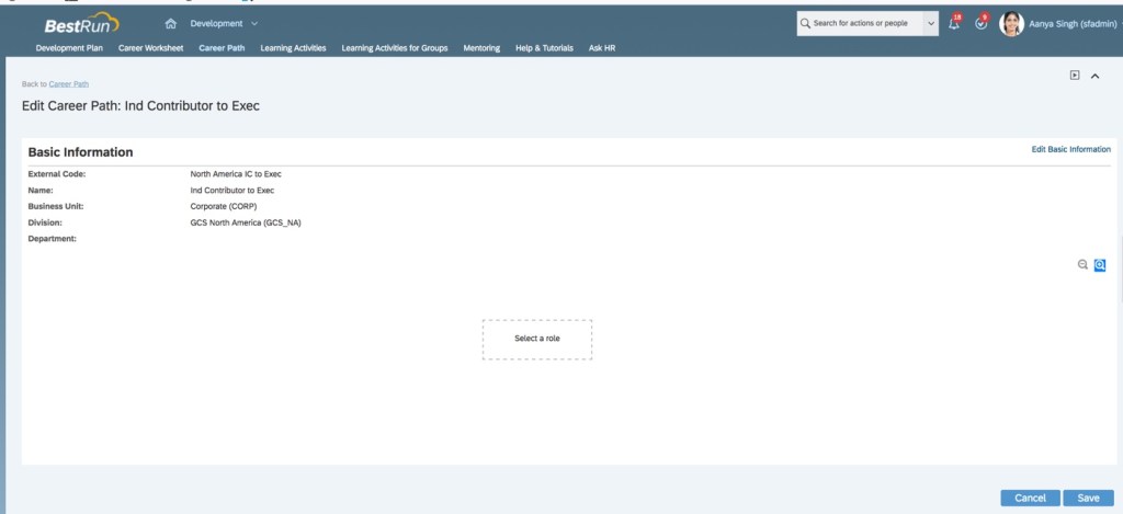 After saving the path’s basic information, an edit page will display with a box to select a role. It is here where you will begin to create the career path.