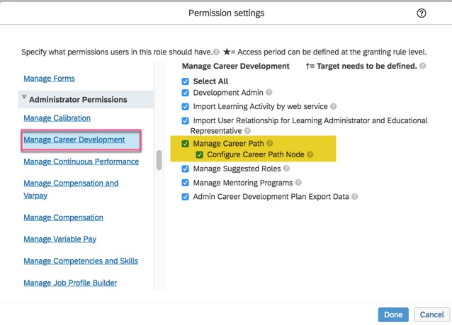 Under Manage Career Development, grant access to Manage Career Path. This allows the admin role access to define and manage the Career Path. In addition, Configure Career Path Node enables access to define the Career Path node details. This allows the admin to configure the Career Path and to identify which elements to display or hide on role nodes in the career path.