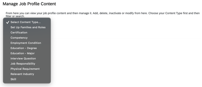 The list of available skills for jobs in SAP SuccessFactors are defined in the “Manage Job Profile Content” screen (just type “Manage Job Profile Content” in the search bar and if you have admin access and the screen name will come up for you to select). You can see in the screenshot below the list of available types of content SAP allows you to create slot populate on a job profile.