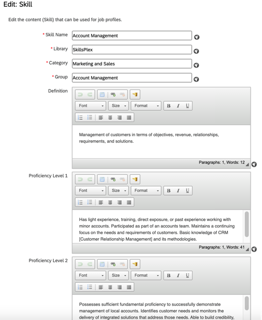 Once we have a list of skills defined, we can start to add them to our individual job profiles (or if you downloaded the predefined skills when you downloaded the SuccessStore job family and role, the skill will already be there when you create the profile). For info on how to create a job profile see Job Profile Builder: An Introduction. You can see in the screenshot below, when we look at an existing job profile or create a new one in the “Manage Job Profiles” screen, the skills show up in the area specified for Skills in the job profile template. You can mouse over the skills section to add or edit skills. For each skill added you will also need to specify the proficiency level expected for the job. So for example we have added the “Account Manager” role and all associated skills to our library in one of our earlier screenshots. When we create a new profile for the role, the skill “Account Management” is automatically added at level 3 proficiency, “Building and Managing Teams” at level 3, etc.