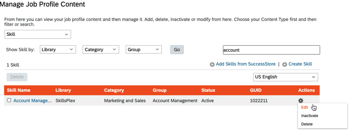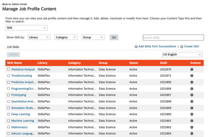 If you click “Skill” from the drop down shown above, you will see a list of the skills currently cataloged in your system as shown below.