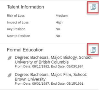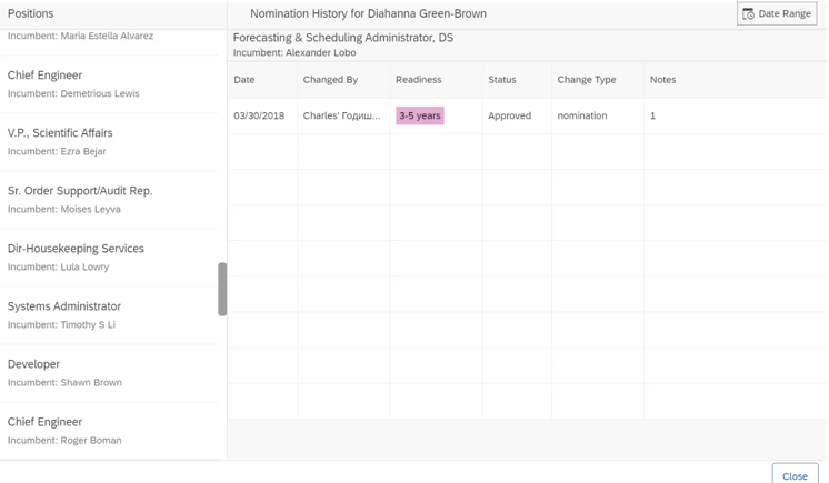 The main new feature exclusive to Succession Management is the ability to view nomination history in the talent card and in the people profile. Users will with Succession Planning permission can click a history icon on these screens to see a list of positions for which the employee has been nominated and information about the nomination history for each including the date, nominator, readiness level, status, change type, and notes. The information includes deleted nominations as well.