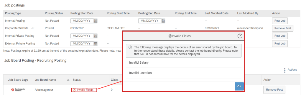 You can now see a new job status, Invalid Fields, in the job postings table when the job board’s system sends back error messages because of one or more incorrectly populated fields while posting a job.