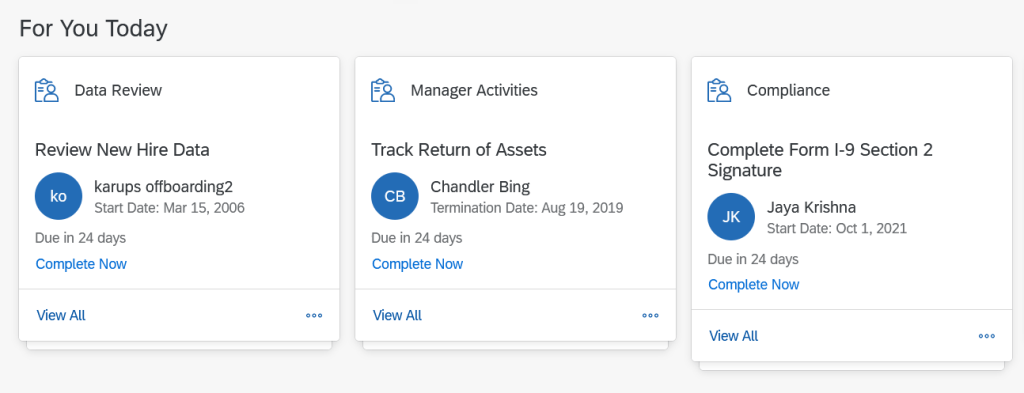 In this section, we cover updates that are visible to new hires /rehires/managers/HR or affect their perceived onboarding experience. First, the Latest Home Page now shows 3 cards in the “For You Today” section relevant for Onboarding Tasks. The cards are “Data Review”, “Manager Activities” and “Compliance”. An example is shown below: