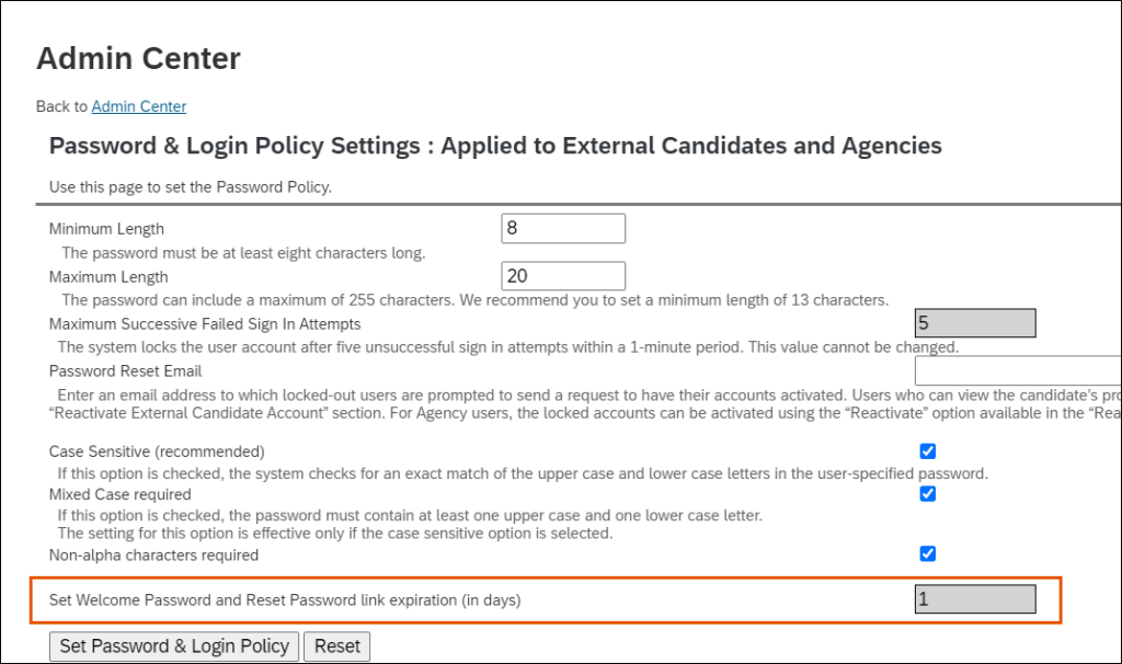 The Set Welcome Password and Reset Password link expiration (in days) option is now disabled for editing. This option is available in the Password and Login Policy Settings: Applied to External Candidates and Agencies page.