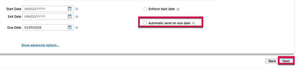 In order to stop this form’s auto routing to the next step, uncheck the “Automatic send on the due date” checkbox and then click on “Next” as shown below.