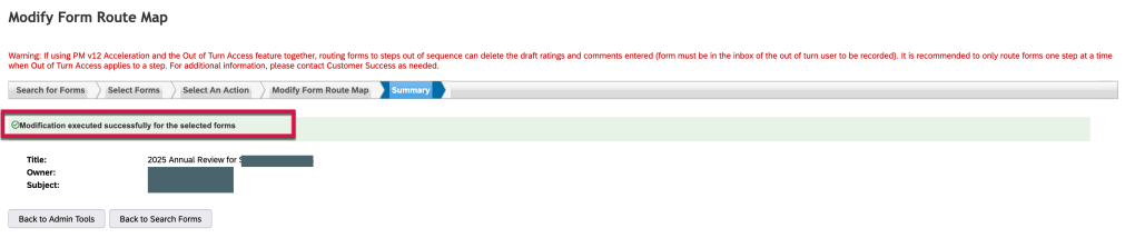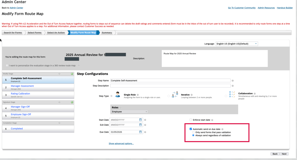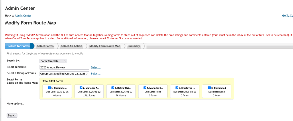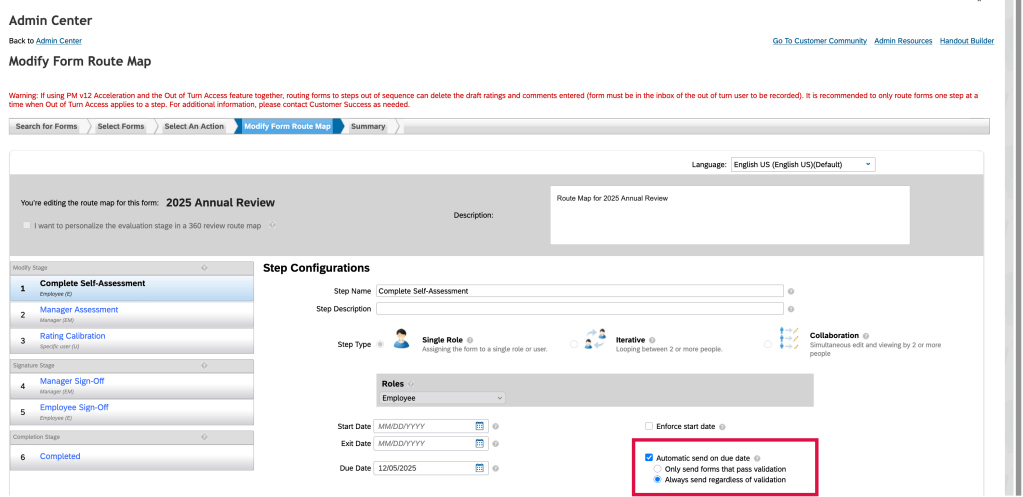 Once the performance review process is in flight, forms will progress through the workflow. With the scheduled background job running nightly, any form still in a step on the auto route due date will automatically route to the next step at the end of day.