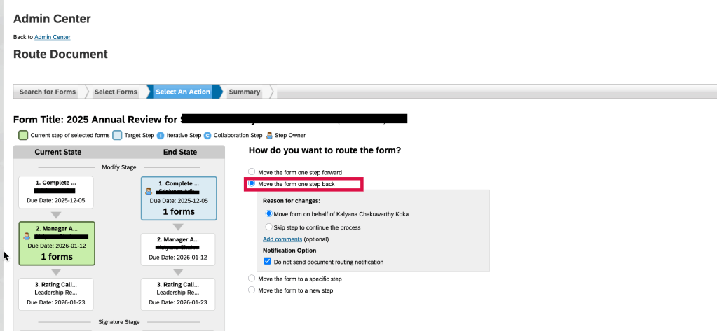 To resolve this, the admin route would have to route the form back to the first step and once the manager role is populated, the form will route correctly. This causes the system to re-evaluate employee data, new managers, route steps, and roles.