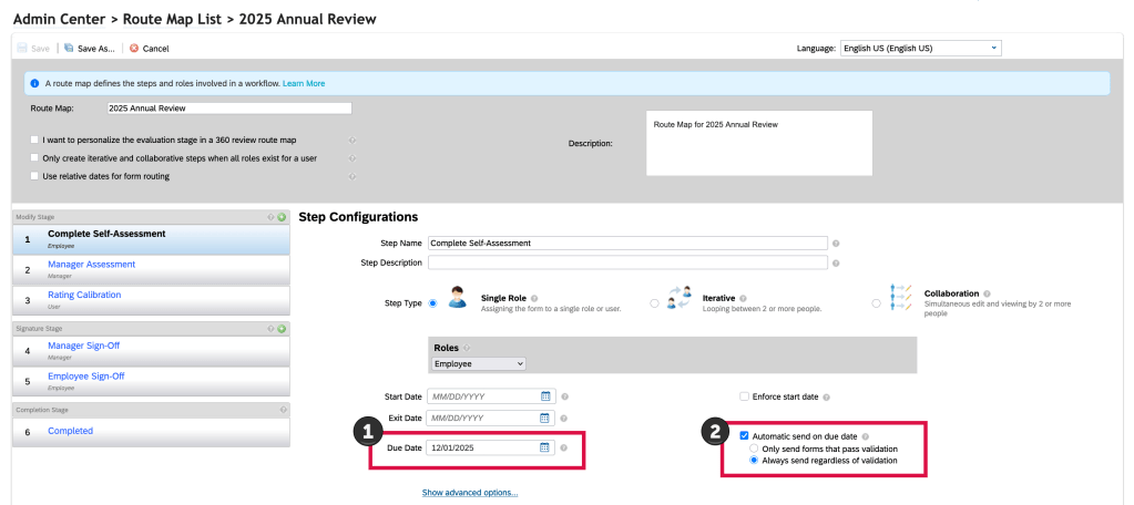 First, identify a due date for the step (1) and then enable the “Automatic send on due date” box (2).