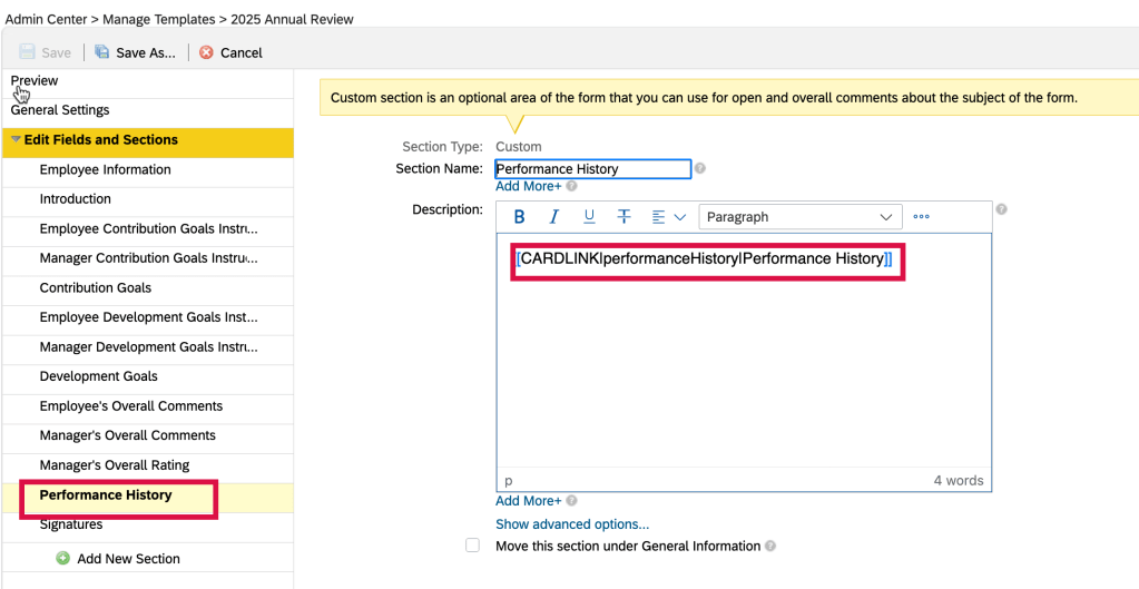 - Configure the performance template, making sure the form aligns with your organization’s performance cycle, timelines, and evaluation criteria