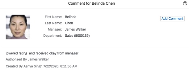 Now when viewing a comment with “authorized by” enabled, the comment detail will include the authorizer as well as the comment creator and date as seen in the example below.