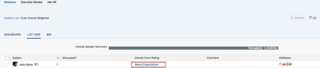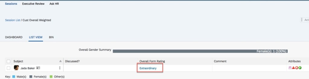 In the example below, you can see the customized weighted rating appearing in a calibration session. It appears in the “Overall Form Rating” column because a manual rating overrides the calculated rating.