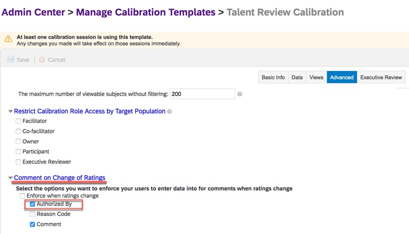 When the rater is required to enter the user name associated with a rating change, your calibration template will have “Authorized By” enabled as shown below.