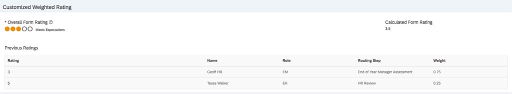This option is helpful if you wish to calibrate the overall form rating based on the ratings given by different roles in different steps instead of using the final overall rating from one role. The customized weighted rating is calculated based on the ratings and weights from the steps and roles that were defined in a business rule. Another rule defines the trigger step used to calculate the overall weighted rating.
