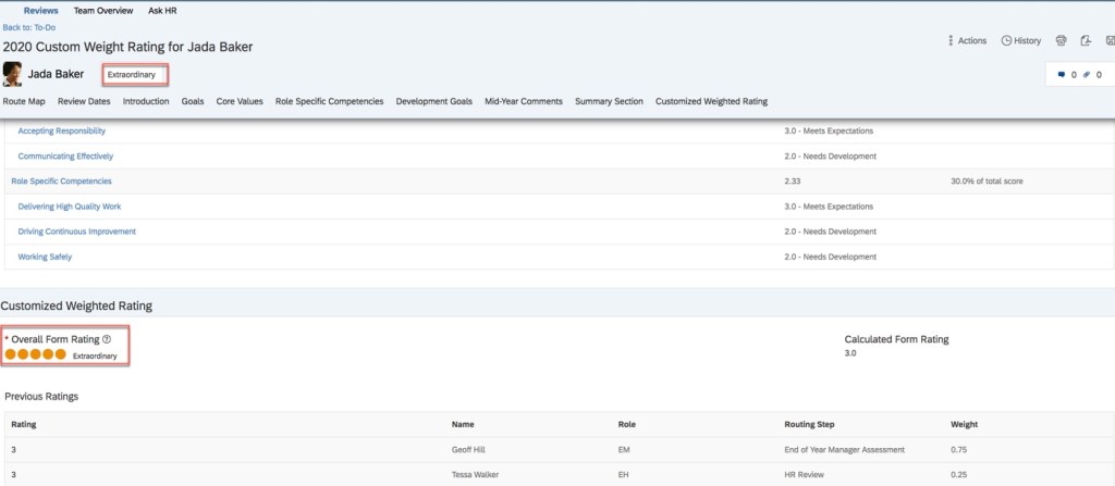 In the Customized Weighted Rating section of the form, the overall rating reflects the updated rating of “Extraordinary” from the calibration session. The overall score pod at the top of the form reflects this updated rating as well.