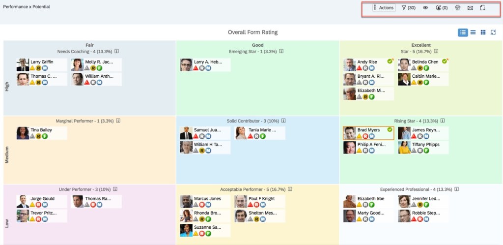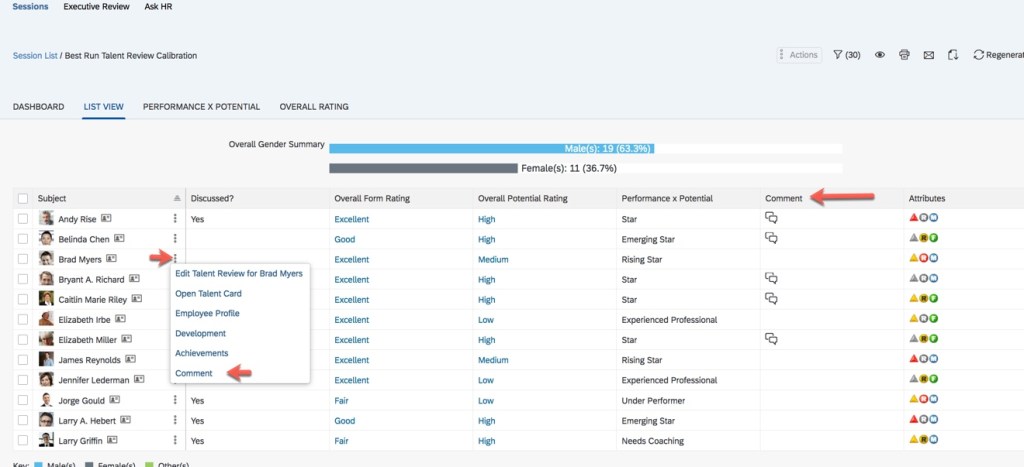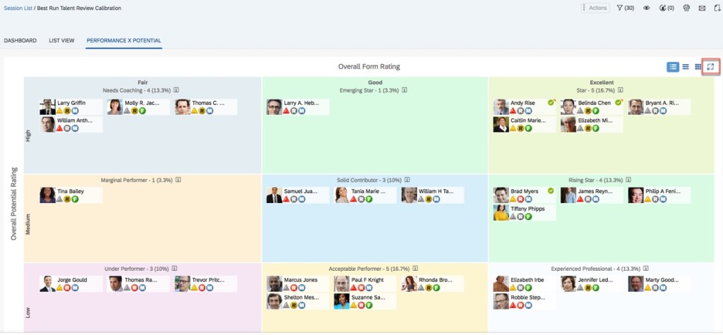 Calibration sessions can display data in many views. In Part II of this series, you will learn how to create these views. There is a display option feature that is particularly useful for the List view tab. Here the data is displayed in a table with a row for each employee being calibrated. If there are several columns for this table, there could be a lot of back and forth scrolling. With the display option feature, some columns may be hidden. There is an icon for display options that enables users to add or remove certain columns from the view. Some are hardcoded and will always show up as display options in a calibration session: