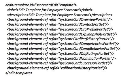Calibration data may appear in People Profile when the Calibration History Portlet is configured. This portlet provides a snapshot of calibration session data along with ratings. The background element for the portlet must be added to the data model. A code segment sample is shown below.