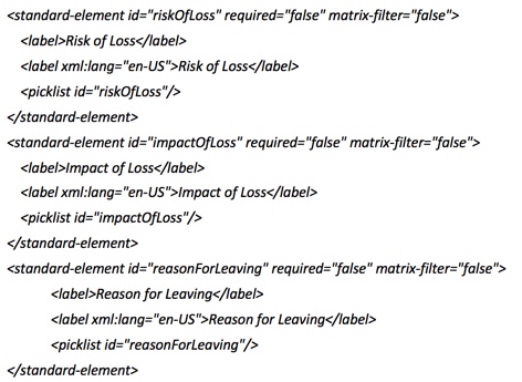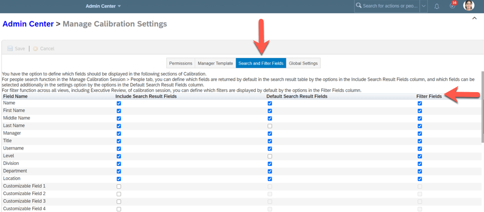 These will always appear as filter fields for a calibration session. If Risk of Loss, Impact of Loss and Reason for Leaving are also in your data model, these fields will also be filter fields. The 15 custom fields that may be defined in the data model may also be added as filter options. To set this up, the custom fields must be part of the default filter in the data model as shown below in the code segment sample.