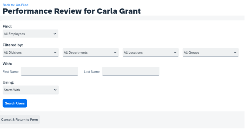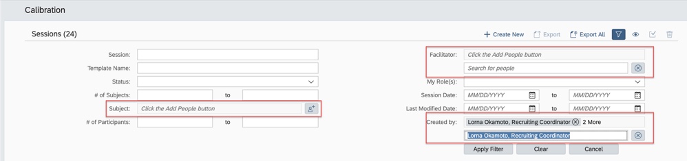 Filter Options are used in a calibration session to narrow the list of the employees that display. If there are a large number of subjects, this is a way to view a smaller group that meet the filter criteria. It may be more manageable to view subsets of employees during the session.