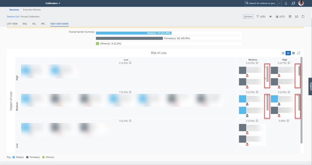 There are three standard elements that may display in some of the views in a calibration session. If you are using SAP SuccessFactors Succession, these most likely are in used for Talent Flags and Matrix Grid reports.
