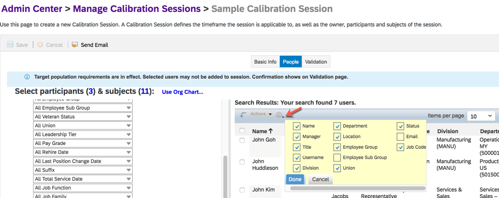 Manage Calibration Sessions tool. After searching for users through the org chart or advanced search and then adding the selected users as participants and subjects, a warning message will appear if any contingent workers are included. Message will include which contingent workers been removed