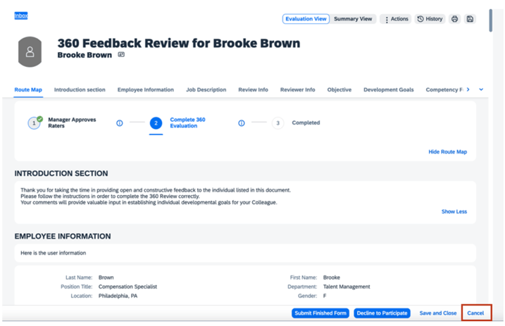 Canceling an opened 360 Reviews form