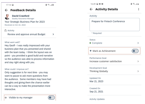 On the Android app, the Visible to my manager switch and the Mark as Achievement switch have wider tracks, and new color mappings.