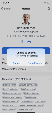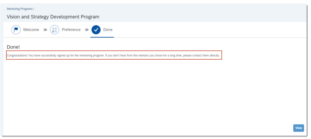 When users sign up for an open enrollment or unsupervised program as a mentee there is a “success” message. The message has been enhanced to now include a reminder for the user that they can contact preferred mentors directly if they don’t hear from the mentors for an extended period of time.