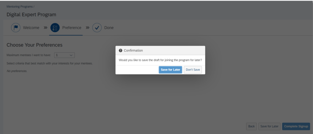 When signing up for a mentoring program and a user decides to Save for Later, there is now a confirmation message pop up for them to confirm if they want to save the draft for joining the program for later.