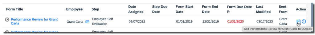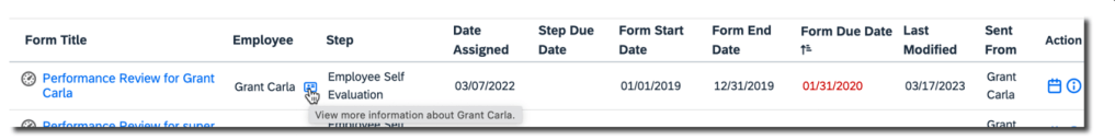 In the Performance inbox, the tooltip for the icon in the Employee column is “View more information about <employee name>”,