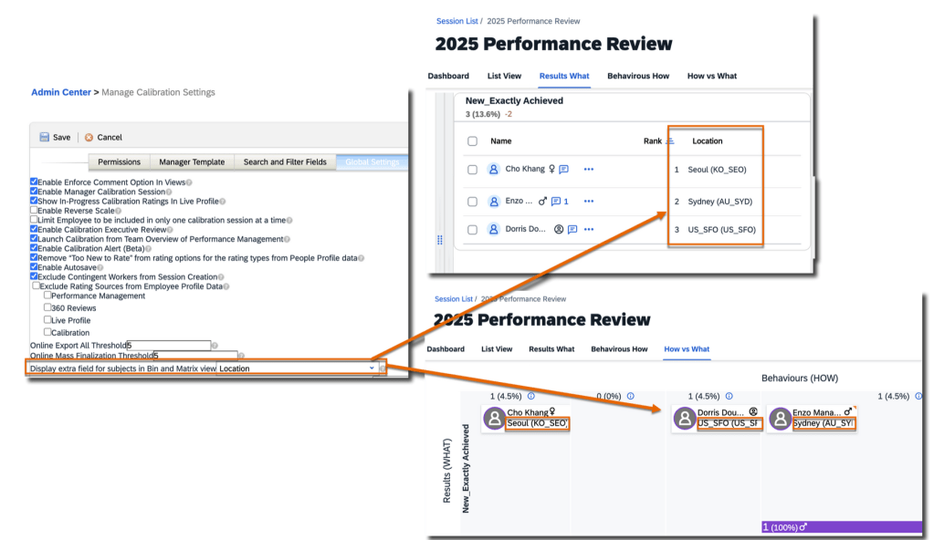 The setting “Add an extra field to people card shown in 9-box view” has been updated to “Display extra field for subjects in Bin and Matrix view“. Found under Admin Center>>Manage Calibration Settings >>Global Settings, you can now enable this option and select an extra field to display for subjects in both Bin and Matrix views. Any field that was previously selected for display in the Matrix view will now automatically be visible in the Bin view.