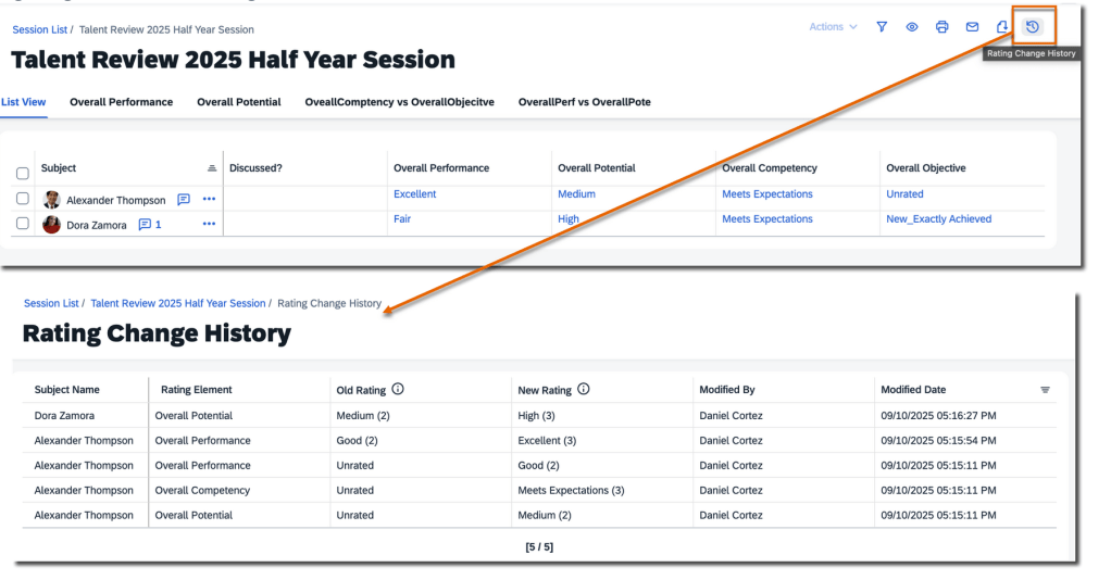 There is a new Rating Change History icon in the upper-right corner of a calibration session. Clicking the icon opens a Rating Change History page.