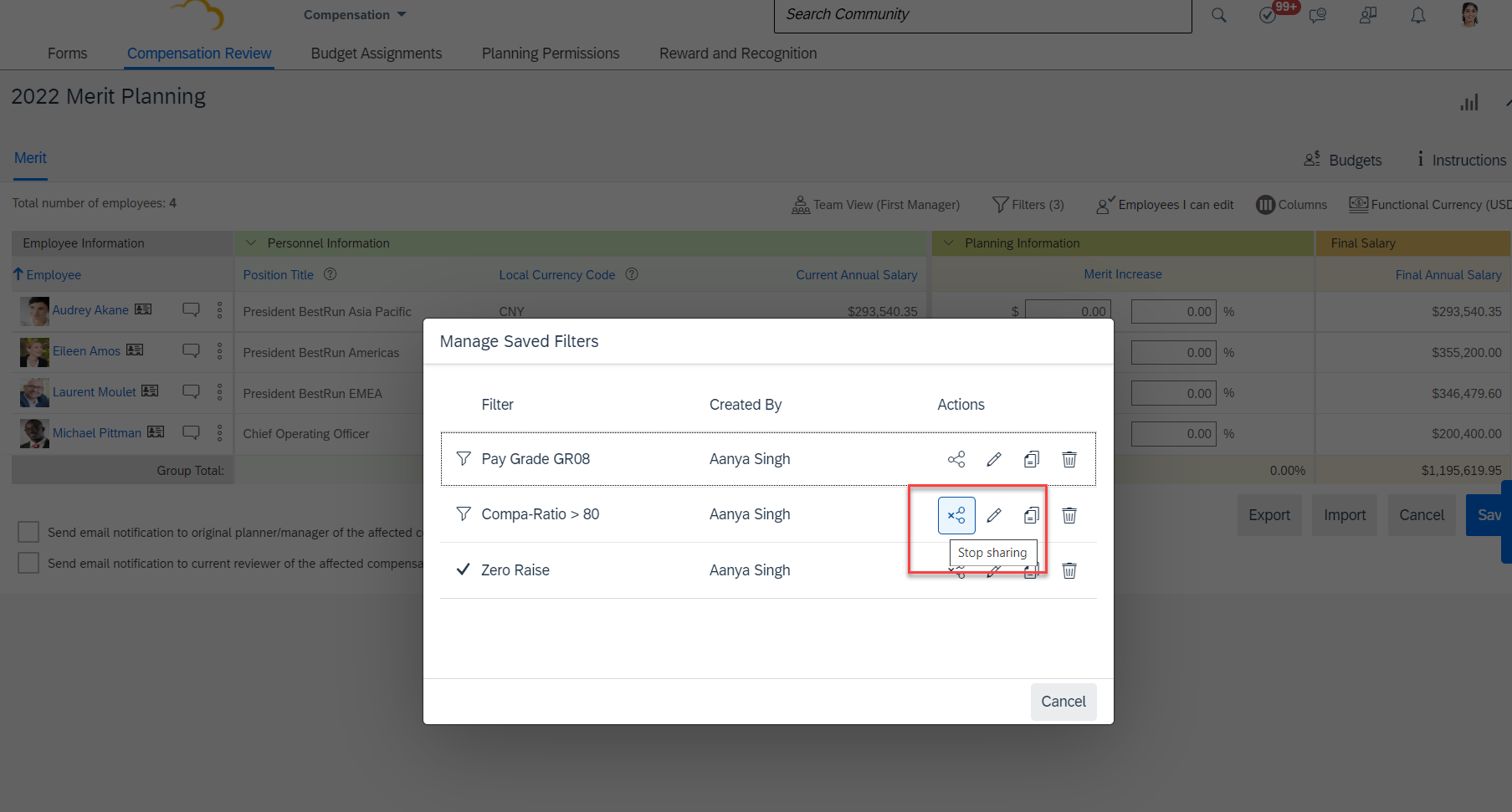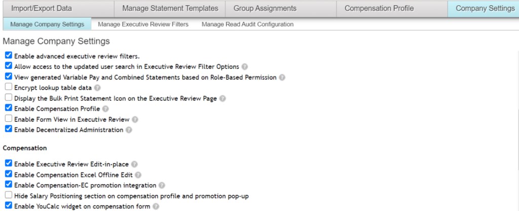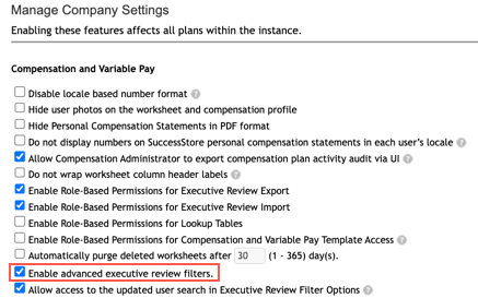 Why it matters: We now support advanced filtering capabilities on worksheets for compensation, variable pay, and total compensation plans. To enable advanced filters on worksheets, go to Compensation Home Actions for all Plans Company Settings Manage Company Settings and enable the Enable advanced filters on worksheets checkbox. You can have up to 30 criteria per filter spread across one or multiple conditions. The advanced filtering capabilities on the executive review are now extended to the worksheets.