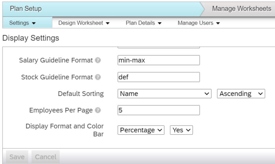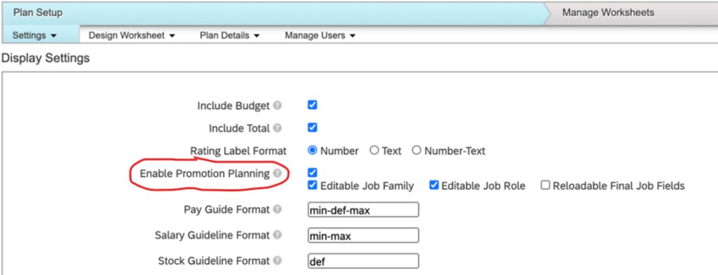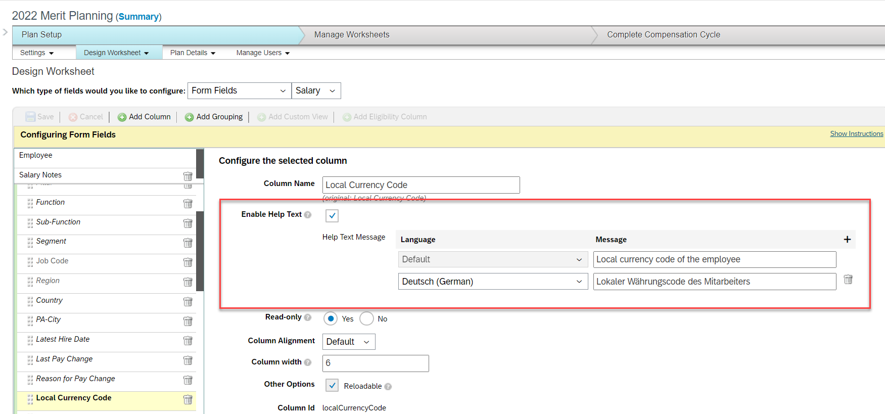 New: Additional options to configure visibility of custom fields for the Compensation Profile and the worksheet in the Design Worksheet tool when configuring columns for a worksheet. These options apply to the Compensation module for the worksheets and the executive review.