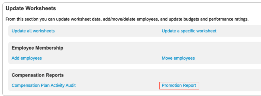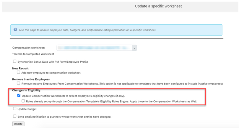 Previously: In the previous version, you opened a support ticket to configure and schedule the job in Provisioning. You could and can still run the job in Compensation Home <Template Name> Manage Worksheets Update all worksheets right away. However, if you must run the job later or on a schedule, you can now configure the job on your own in Job Scheduler. Parameters for the job are the same as those for Update all worksheets.