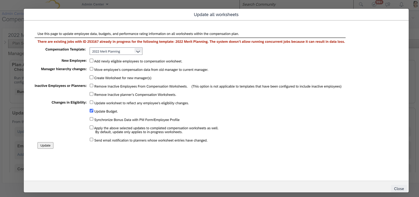 New: You can configure and monitor the job in the Job Scheduler and Job Monitor for compensation worksheets. The parameters for the job are the same as those parameters for the Update all worksheets tool.