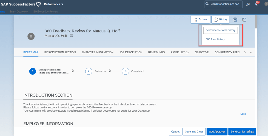 Prior performance and 360 forms are now available within a 360 Review. The History button will display options to view either form type if available.