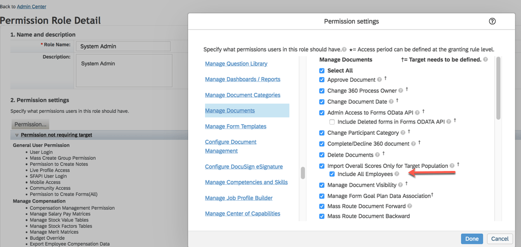 Select a role in Manage Permission Roles. Go to Permission>Administrator Permissions>Manage Document and select “Import Overall Scores Only for Target Population” and “Include All Employees” which allows granted users to update manual overall scores for all employees.